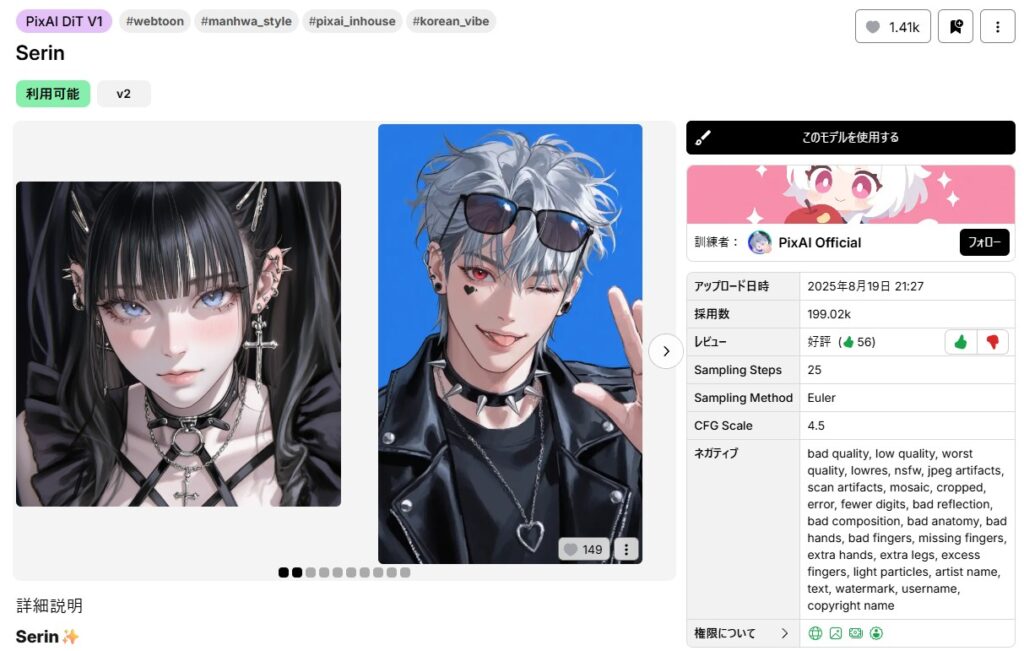 PixAIは、Serinの他にも二次元イラスト特化の生成AIモデルを多数用意しております。すべて無料かつ日本語で利用可能です。様々な異なる魅力を持つモデルを使って、皆様のクリエイティブ活動をより充実させていきましょう。