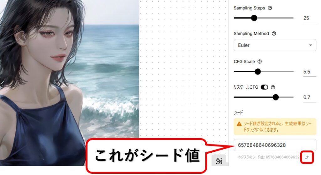 | シード | 再生成時の一致性 | 気に入った結果のシード保存例:5874695568512077 |