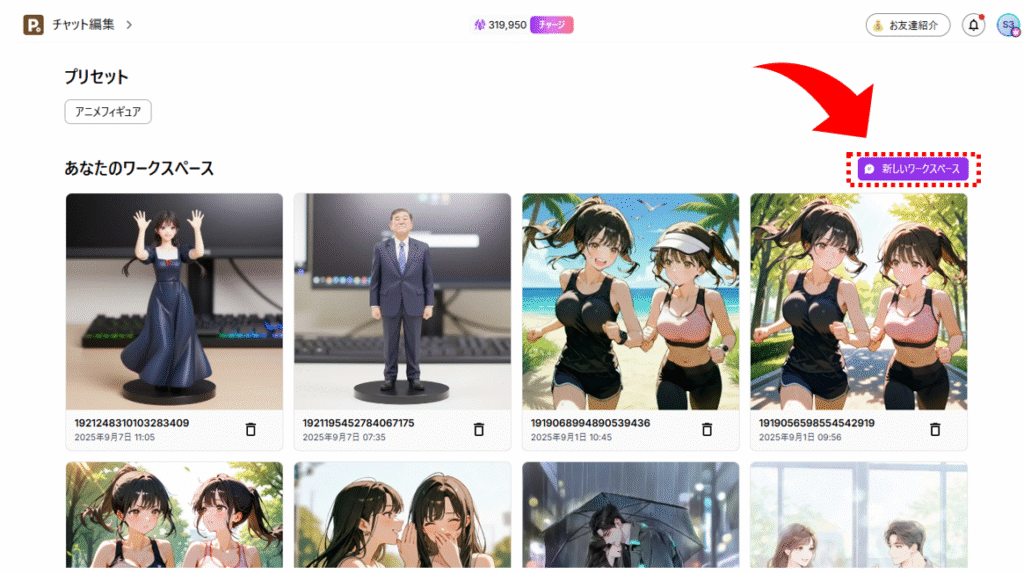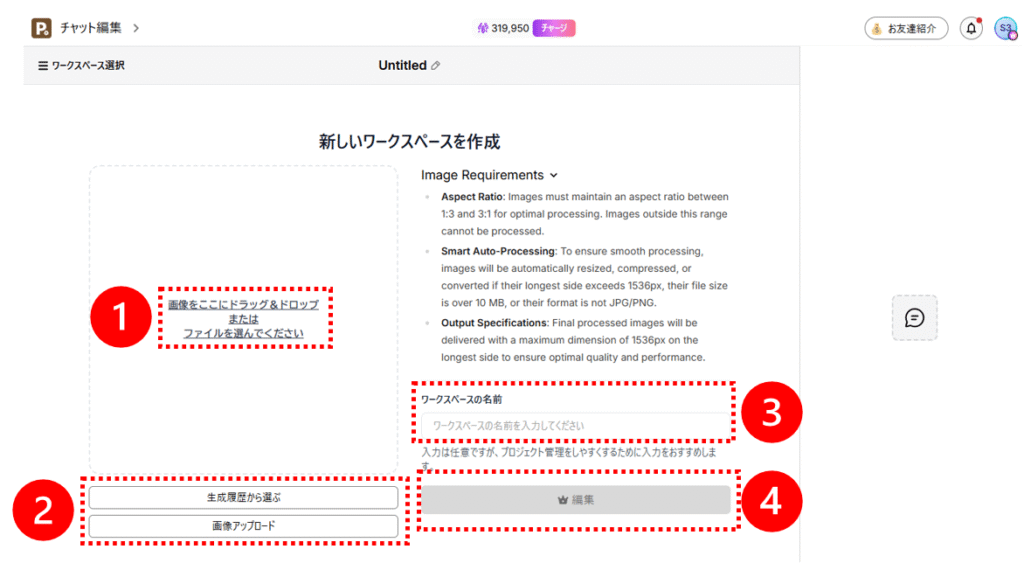 自分の編集したい画像をアップロード、もしくは過去に生成した作品の中から選択します。ワークスペース名の作成は任意ですが、後々作業がやりやすくなるのでネーミングをしておきましょう。最後に編集をクリックするとワークスペースが作成され、チャット編集の準備が整います。