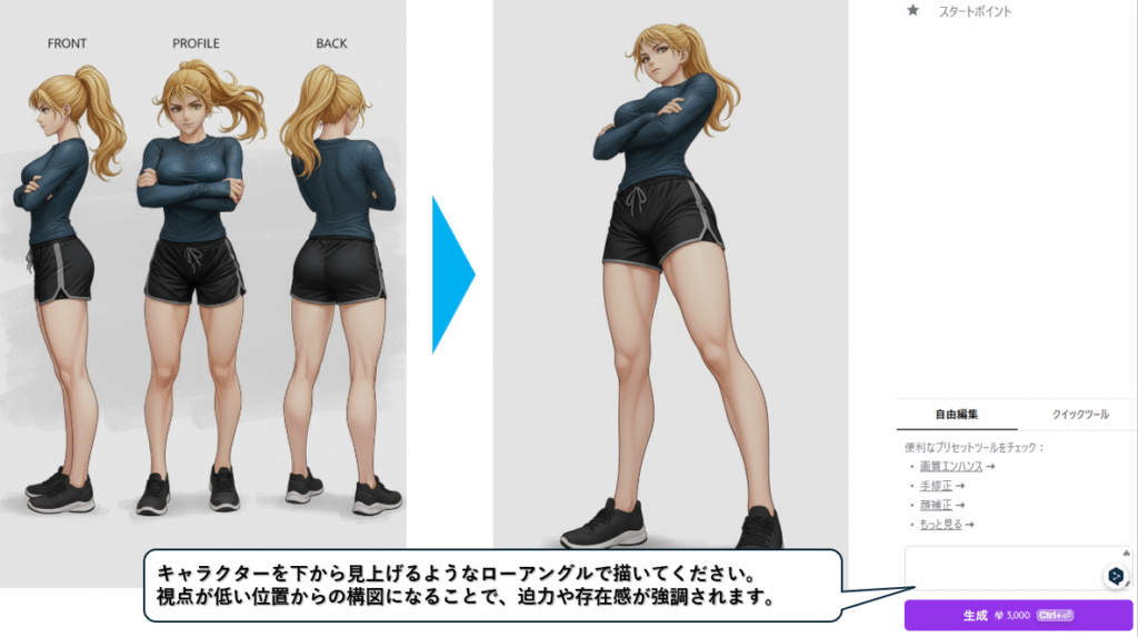 例:「右手を胸の前で軽く握る勝利ポーズにして」→「この人物の視線はカメラ」→と一つずつ指示をチャットの中で伝えていきましょう。