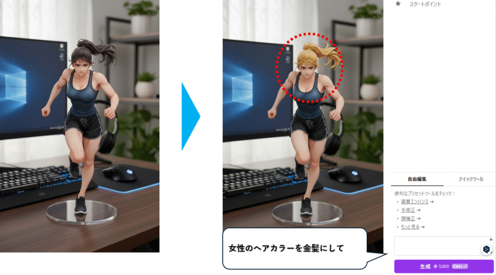 チャット編集だと今までの履歴から特定のポイントを編集するのも楽です。例えば、先ほど生成したフィギュア風イラストの女性の髪色を金髪にしてみました。他は変わってないですよね?