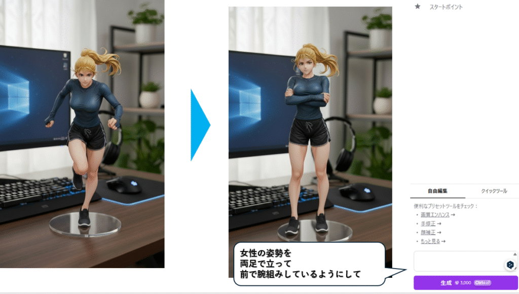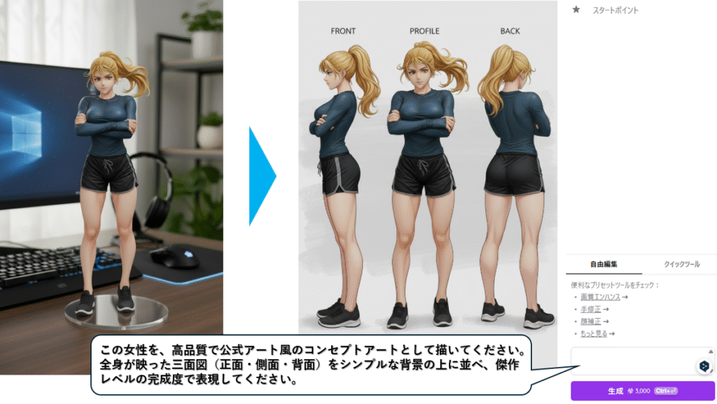 例)「画像のキャラクターを1/7スケールのフィギュアにし、リアルなスタイルで制作してコンピューターデスクに配置してください。