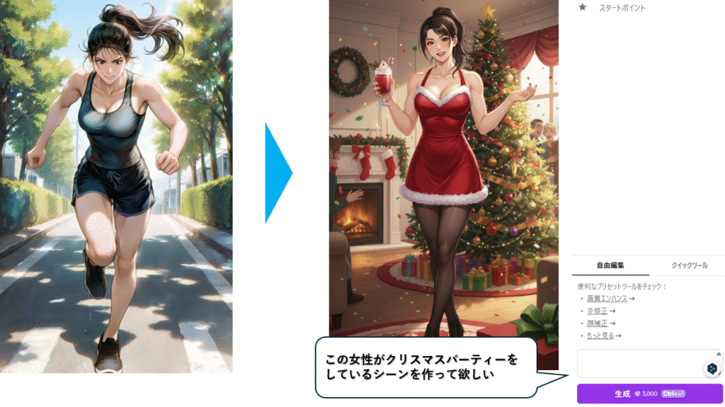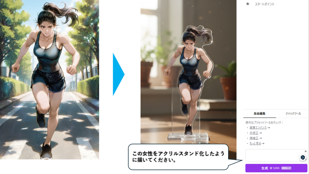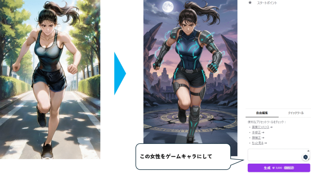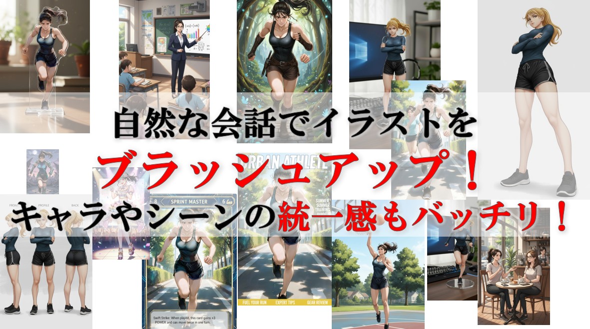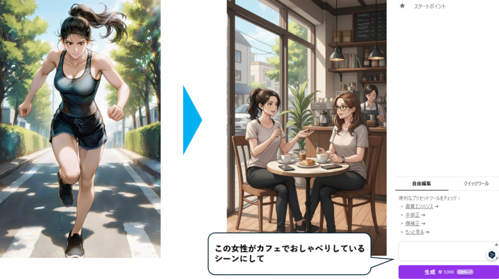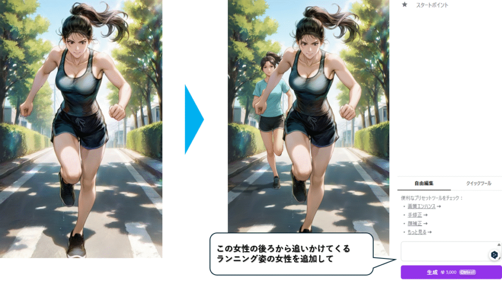 上記例では、「この女性の後ろから追いかけてくるランニング姿の女性を追加して」と頼んだだけで、 元のキャラクターはそのままに、後方にランニングしている女性が加わりました。