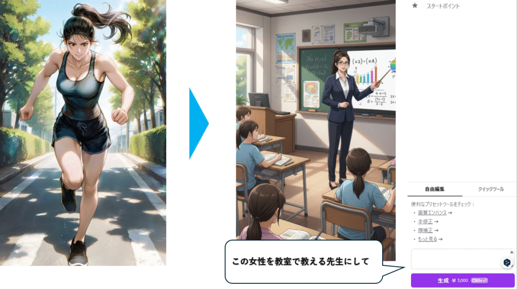 たとえば「女性を教室で生徒に教える先生」に編集すると、黒板の前に立って授業をする姿や、生徒へ説明するしぐさが自然に表現されます。