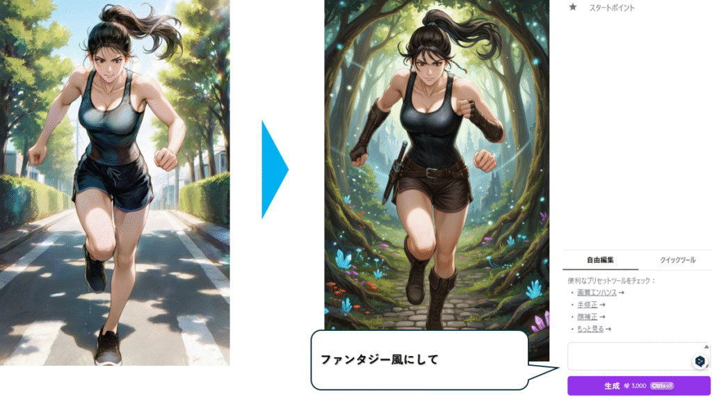 キャラクターをファンタジー風に編集すると、古城や魔法陣が広がる背景に立たせたり、剣や杖といった武器を持たせたりすることができます。やってみてください。まるでゲームのワンシーンやライトノベルの挿絵のような仕上がりになります。「ファンタジー風にして」だけでもかなりいい感じに仕上げてくれます。「勇者や魔法使いにして」みたいな指示でもいいと思います。