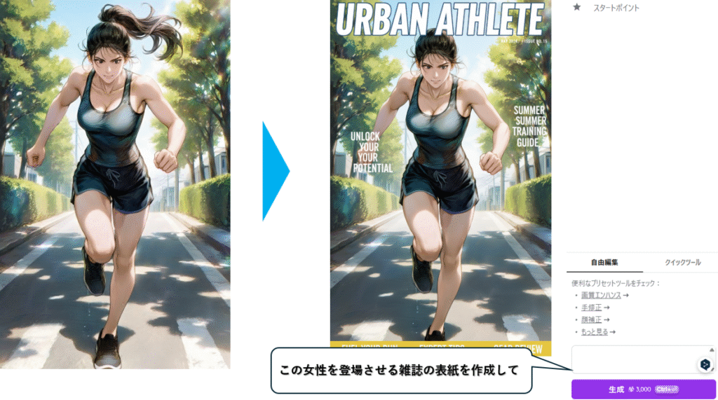 キャラクターを雑誌の表紙風にデザインすることも可能です。タイトルやテキストが崩れず、まるで実在の雑誌から切り抜いたような仕上がりに。