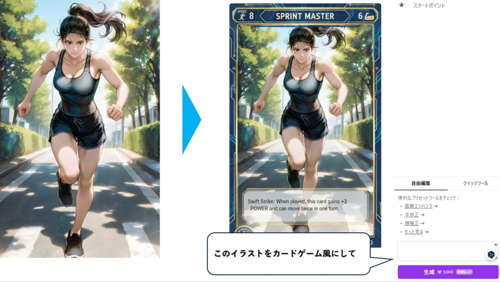 チャット編集では、キャラクターやシーンを「雑誌の表紙」や「カードゲームの1枚」といったコンテンツ風に仕上げることができます。PixAIはイラスト生成に特化した生成AIツールですが、簡単なタイトルや見出しを描き込むことも可能です。特に英語は文字崩れも起こりにくく、良い感じで仕上がります。
