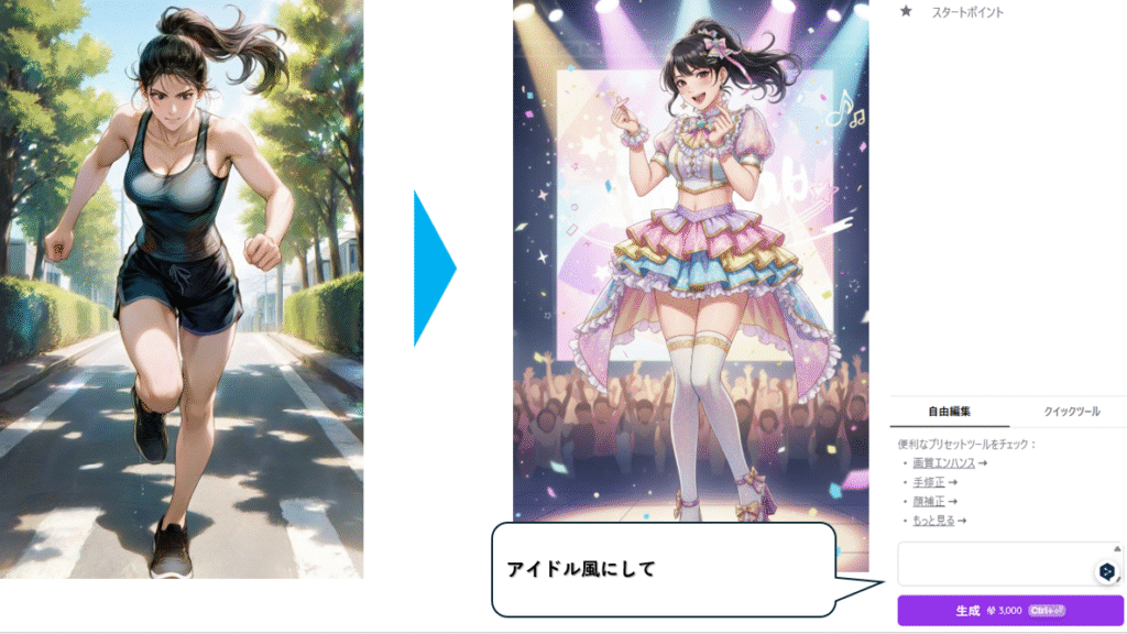 キャラクターをそのまま活かしたまま、まるでアイドルのようなステージシーンに仕上げることができます。衣装をステージ衣装風に変え、背景に照明やスポットライトを加えるだけで、ライブパフォーマンスをしているような華やかな雰囲気に早変わり。SNSアイコンやファンアート風のビジュアルとしても活用できる、人気の高いアレンジです。