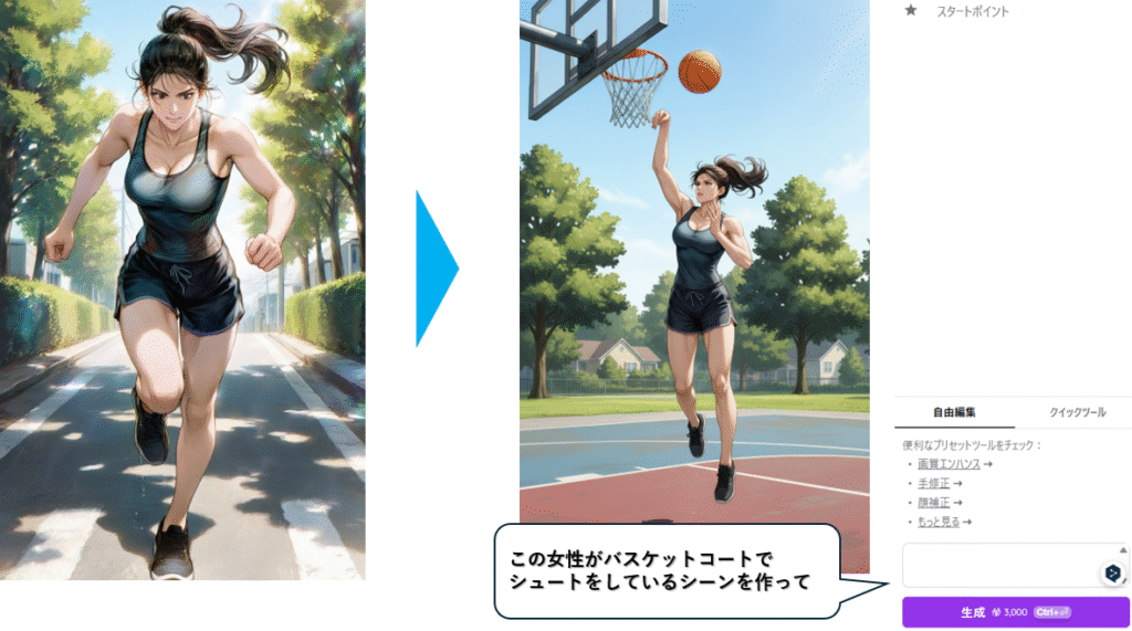 キャラクターをダイナミックなスポーツの場面にも自在に置き換えることができます。たとえば「女性がバスケットコートでシュートをしているシーン」という指示をすると、ジャンプしてボールを放つ瞬間や、リングを狙う真剣な表情までリアルに再現可能です。